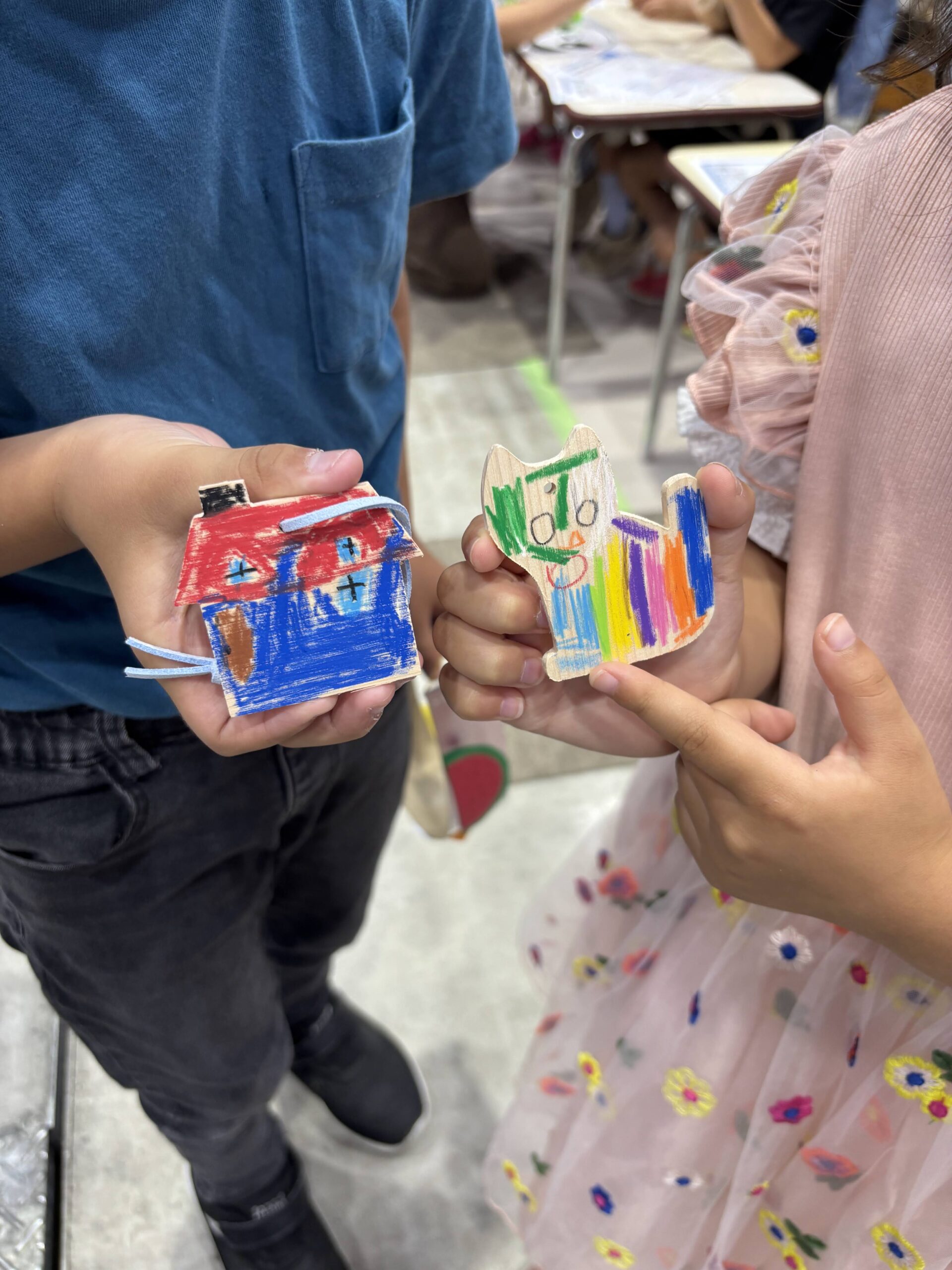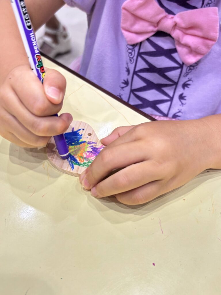 未就学児~幼児を対象に、間伐材の天竜ヒノキで作ったネームタグのおえかき体験をお手伝いさせていただきました。好きな形を選んでいただきポンキーペンシルで自由におえかきし、紐を通して結んで完成!オリジナルのネームタグ作りを楽しむ子どもたちでにぎわい、当日は約300名にご参加いただきました。